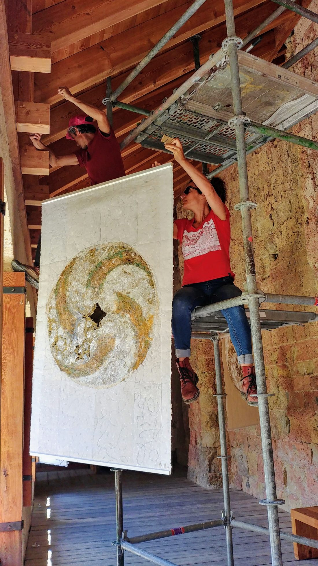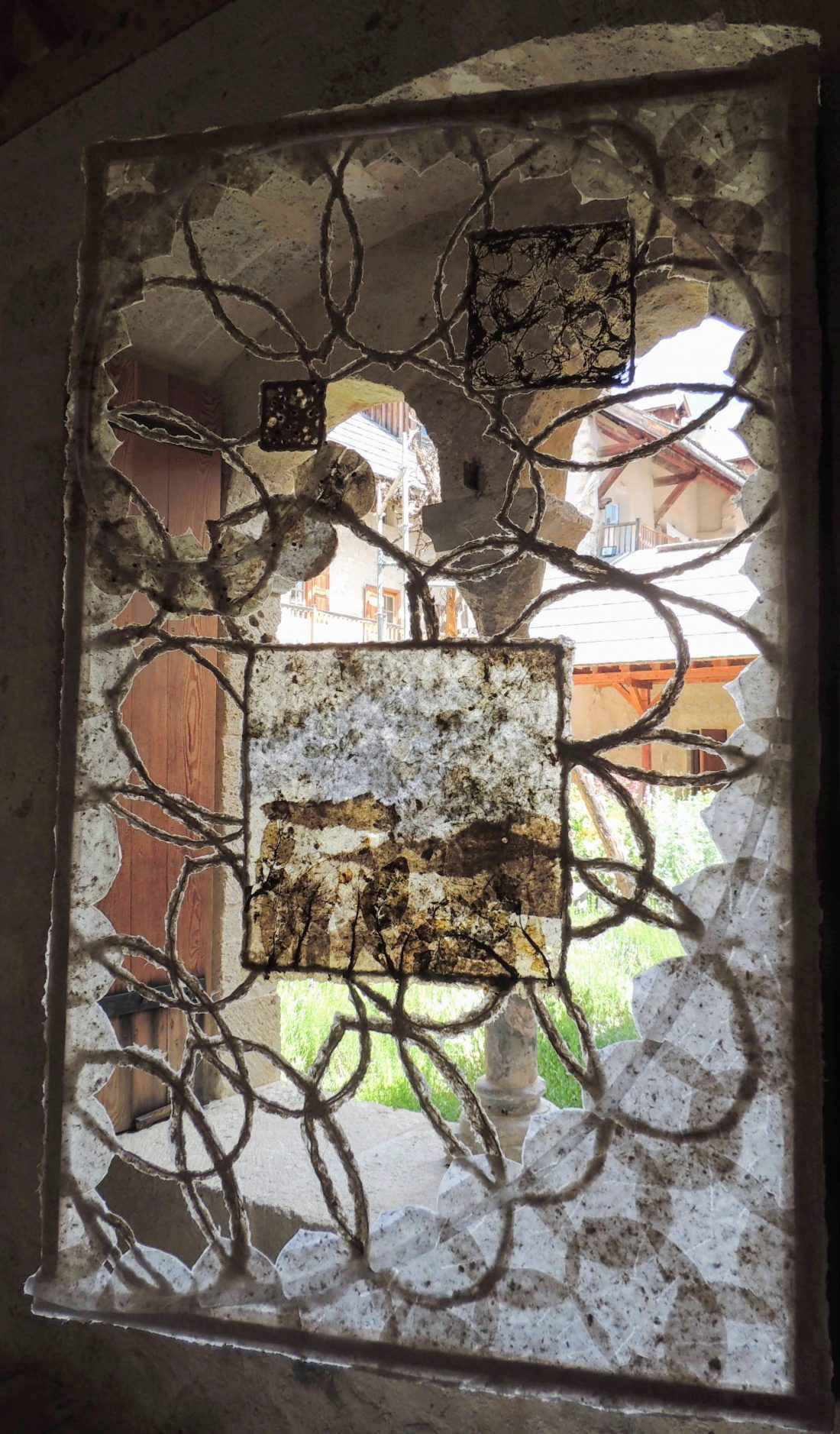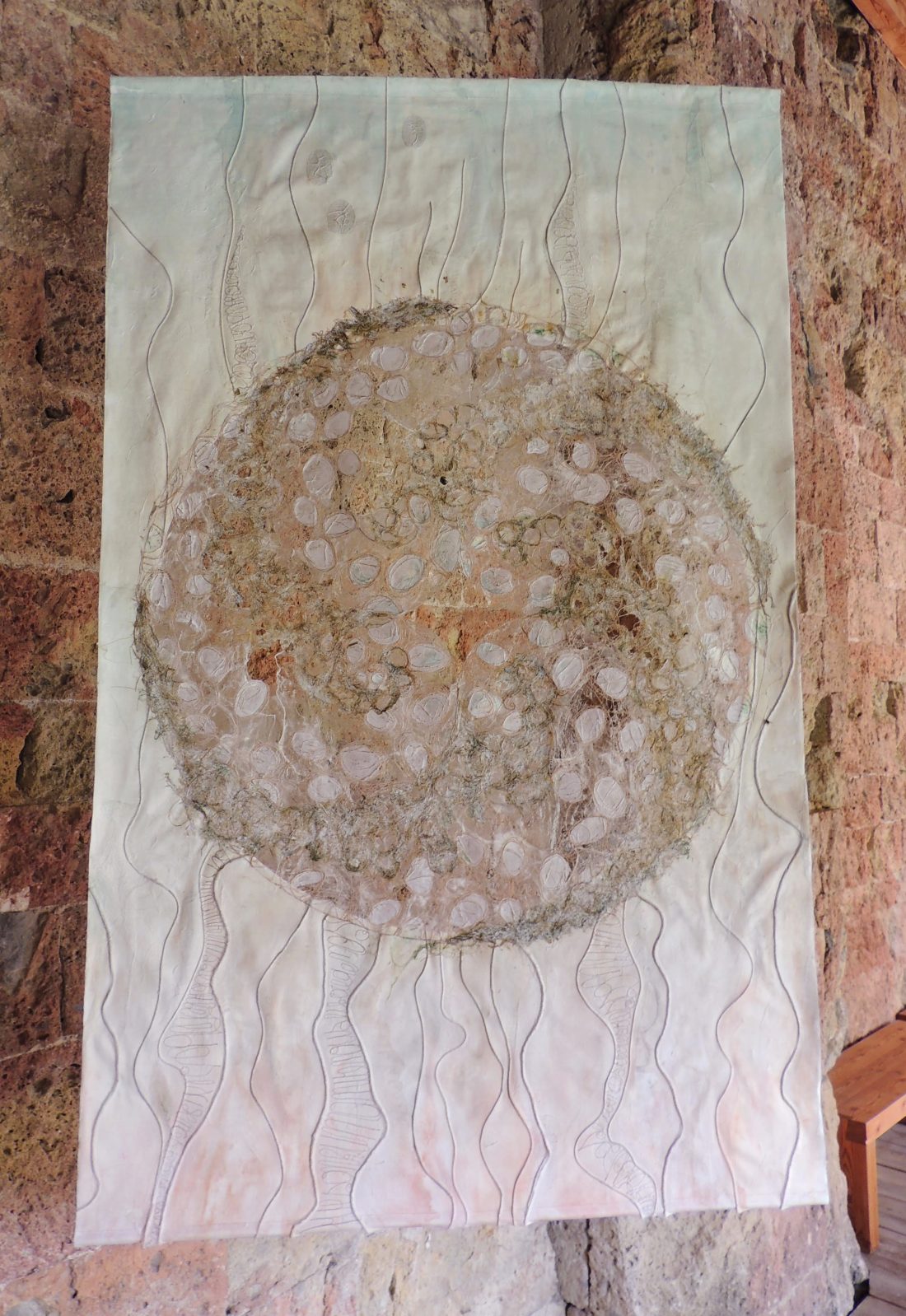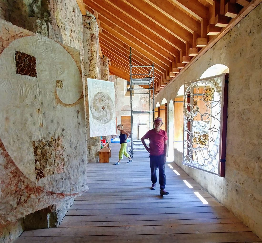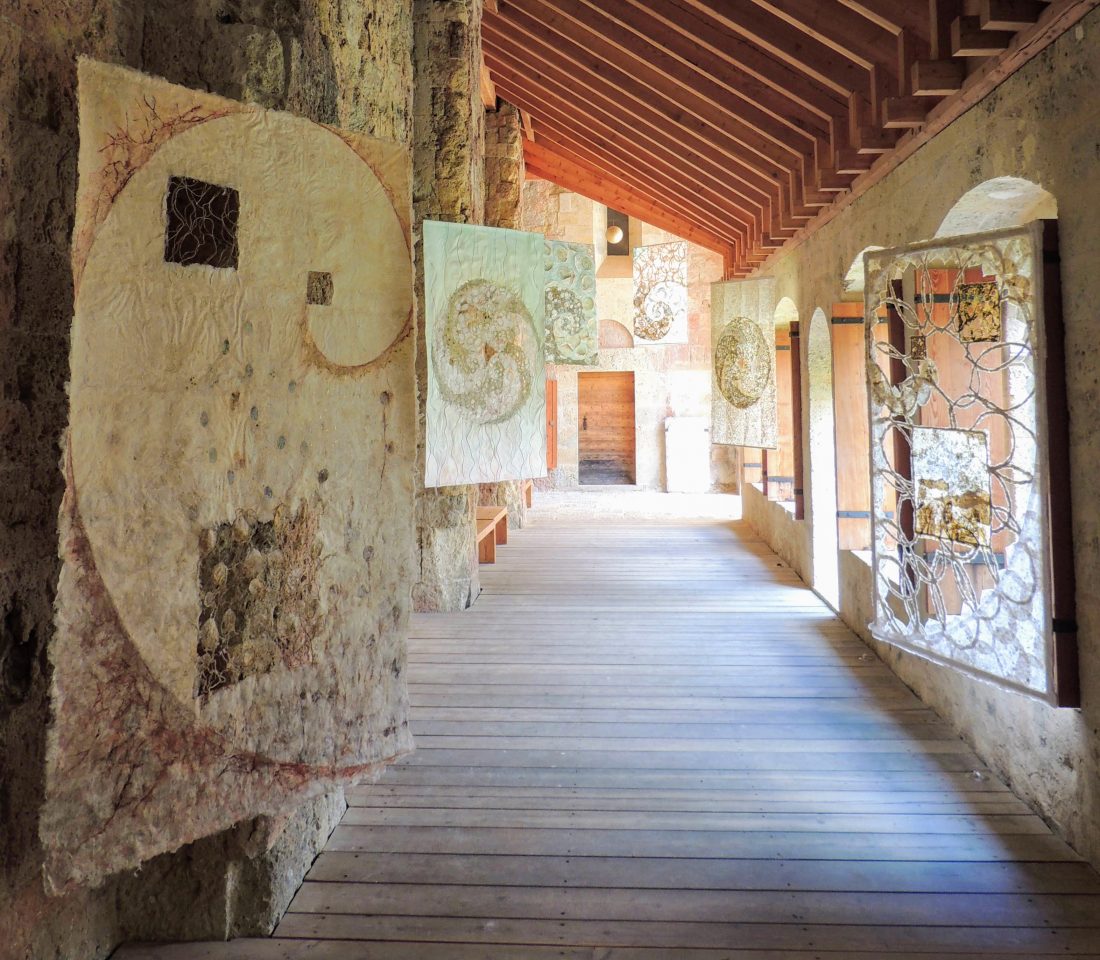 Le travail à deux s’est révélé empreint de ce cheminement spirituel. Au début, chacune s’affirme selon une trame, des couleurs et un graphisme communs. Ensuite, une recherche , une nécessité d’interpénétrer les matières propres à chacune a constitué l’essence même de la création et de leur envol pour traverser les défis lancés.