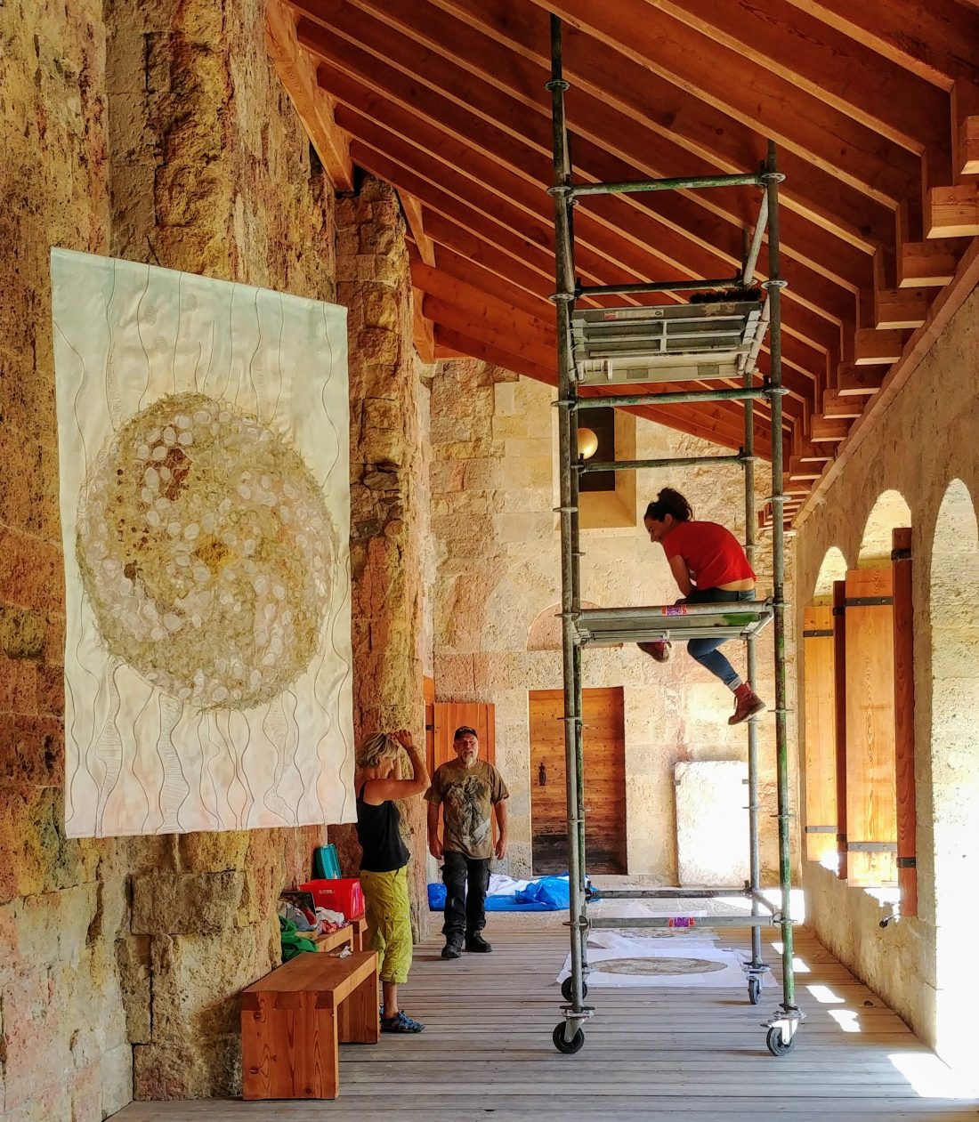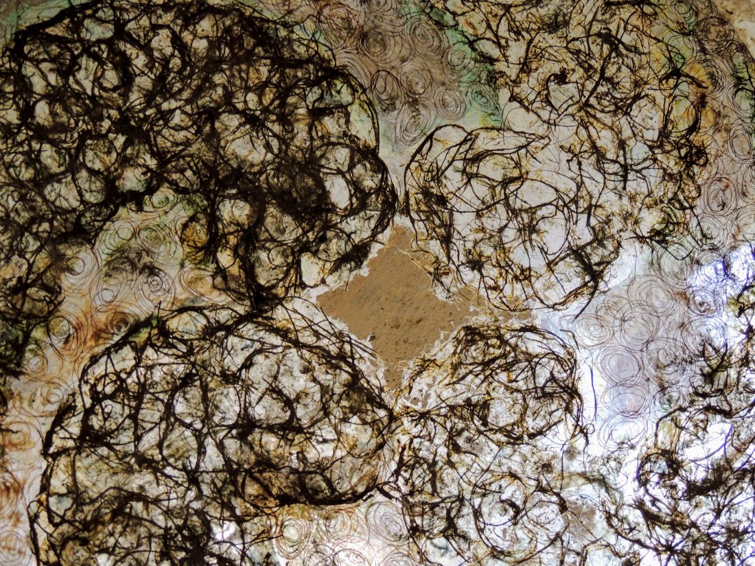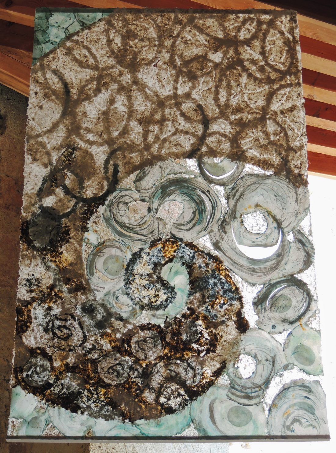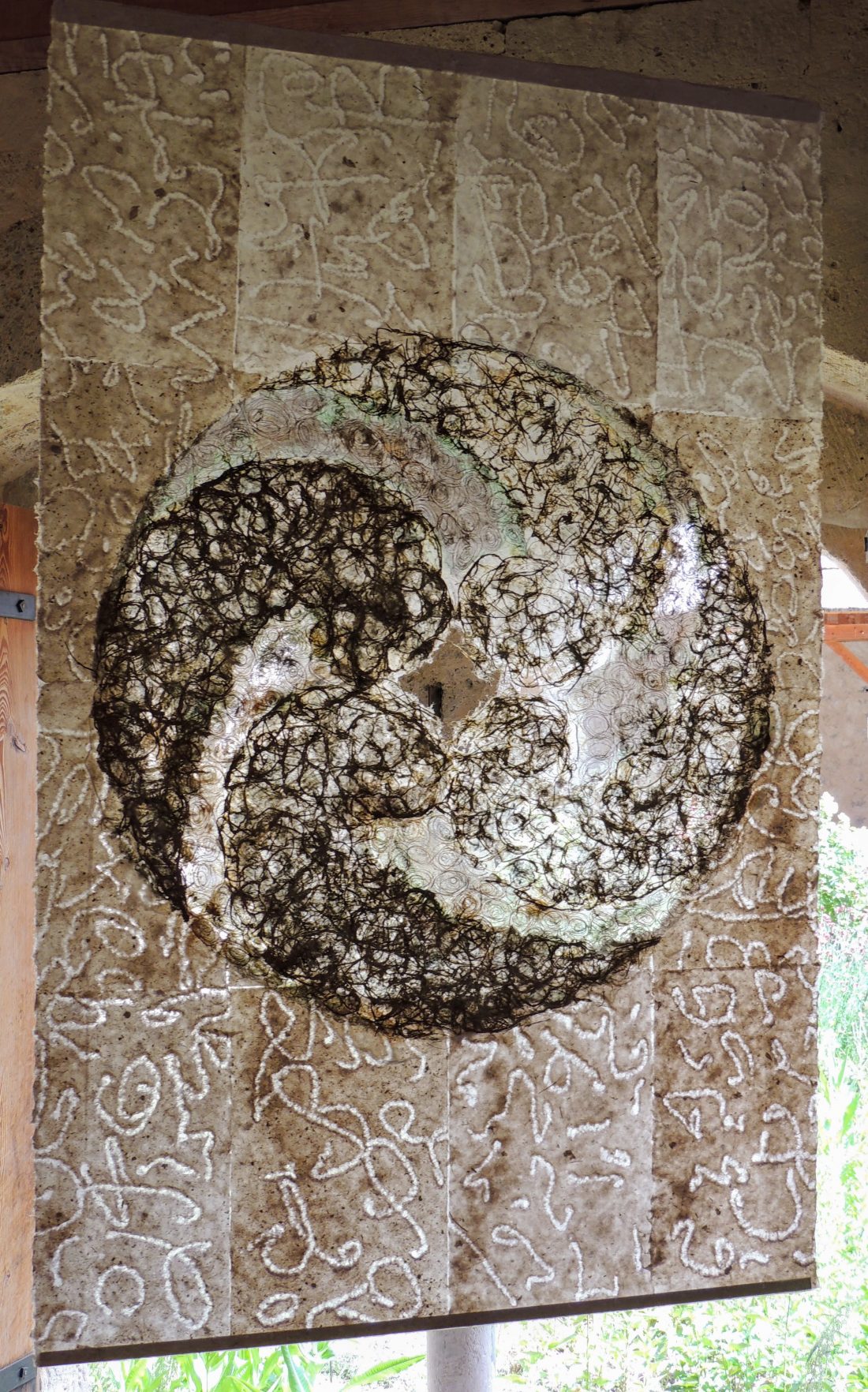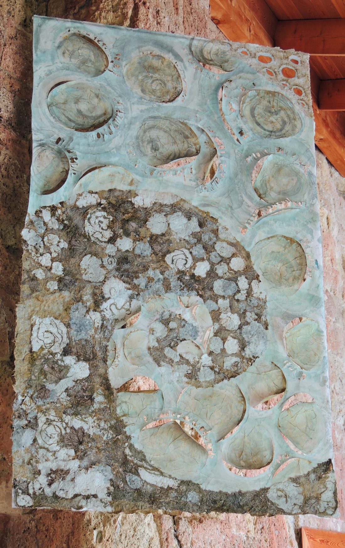 Le travail à deux s’est révélé empreint de ce cheminement spirituel. Au début, chacune s’affirme selon une trame, des couleurs et un graphisme communs. Ensuite, une recherche , une nécessité d’interpénétrer les matières propres à chacune a constitué l’essence même de la création et de leur envol pour traverser les défis lancés.