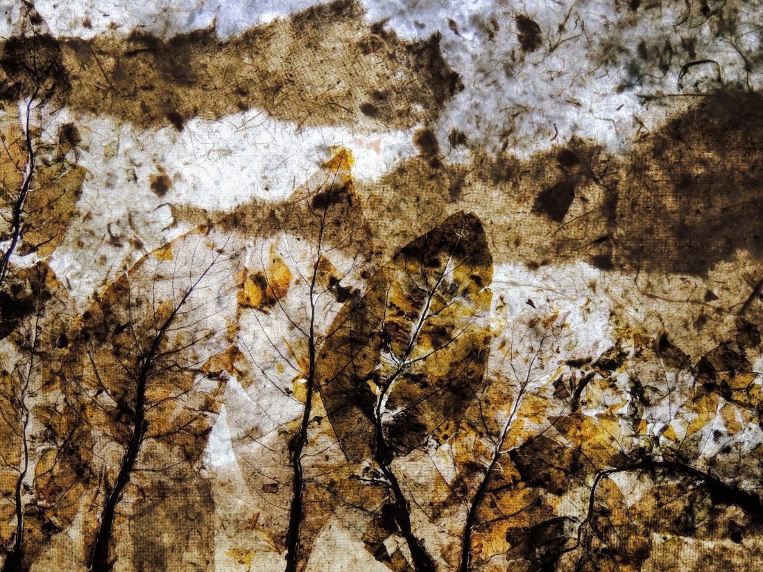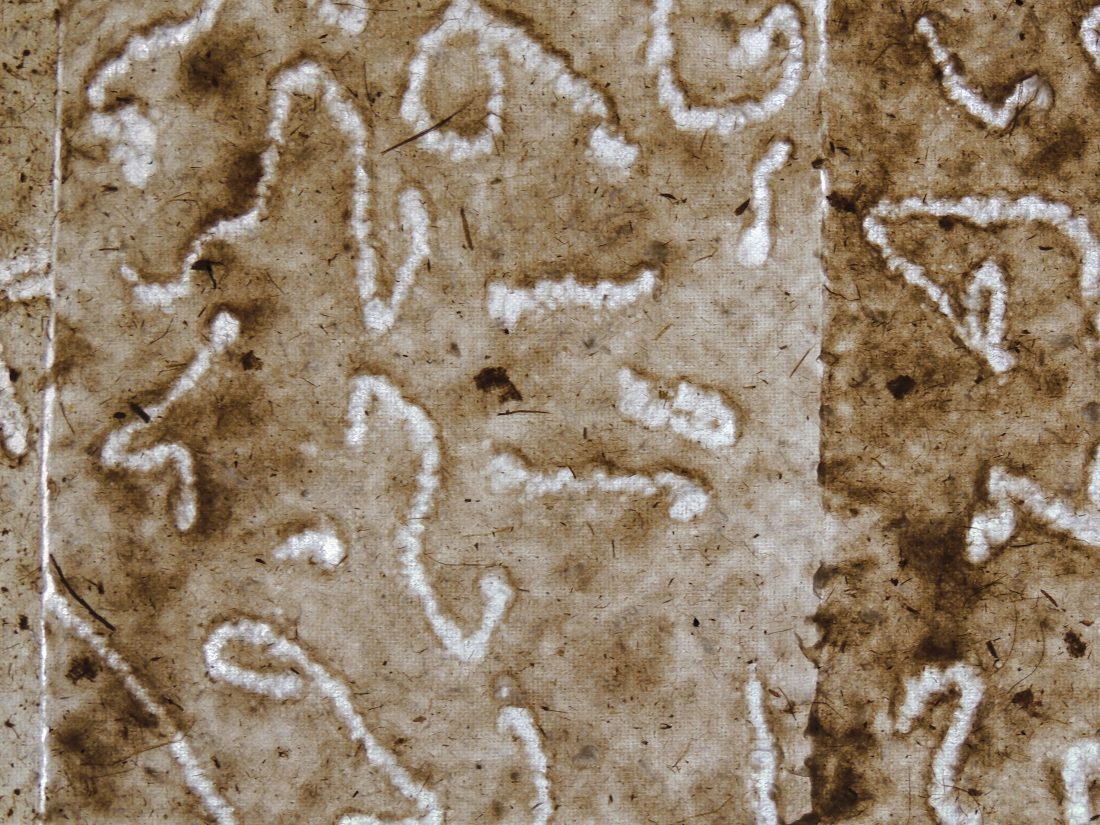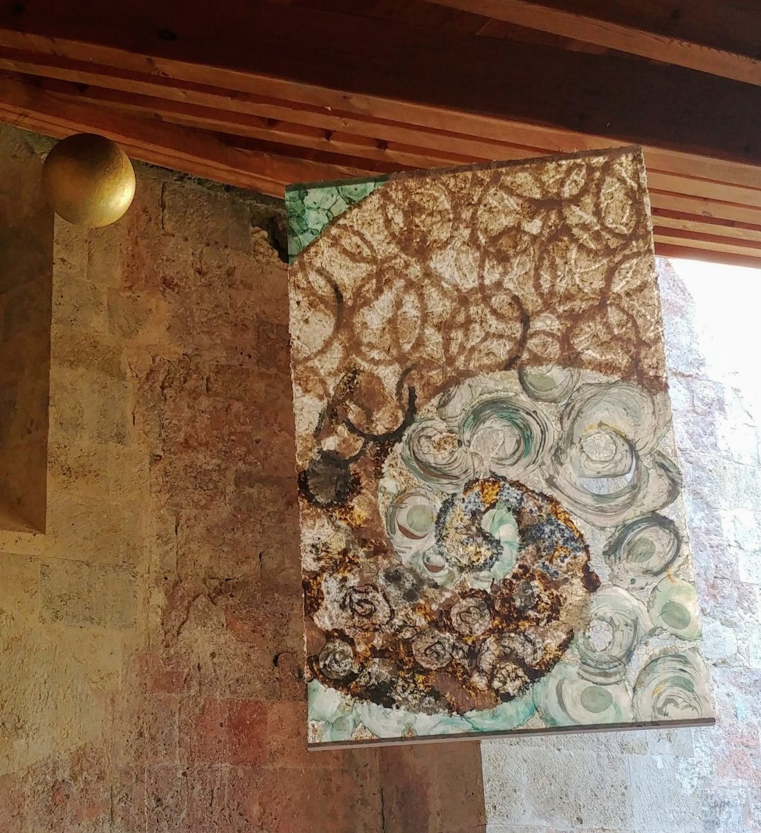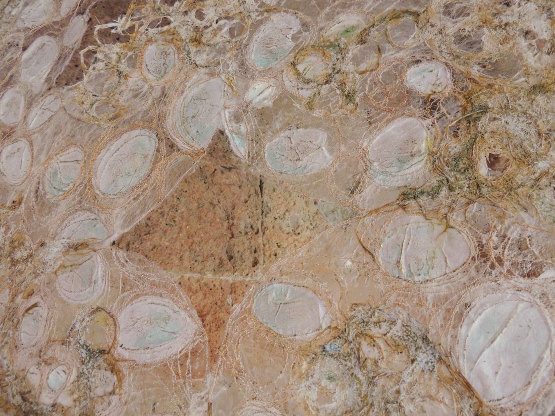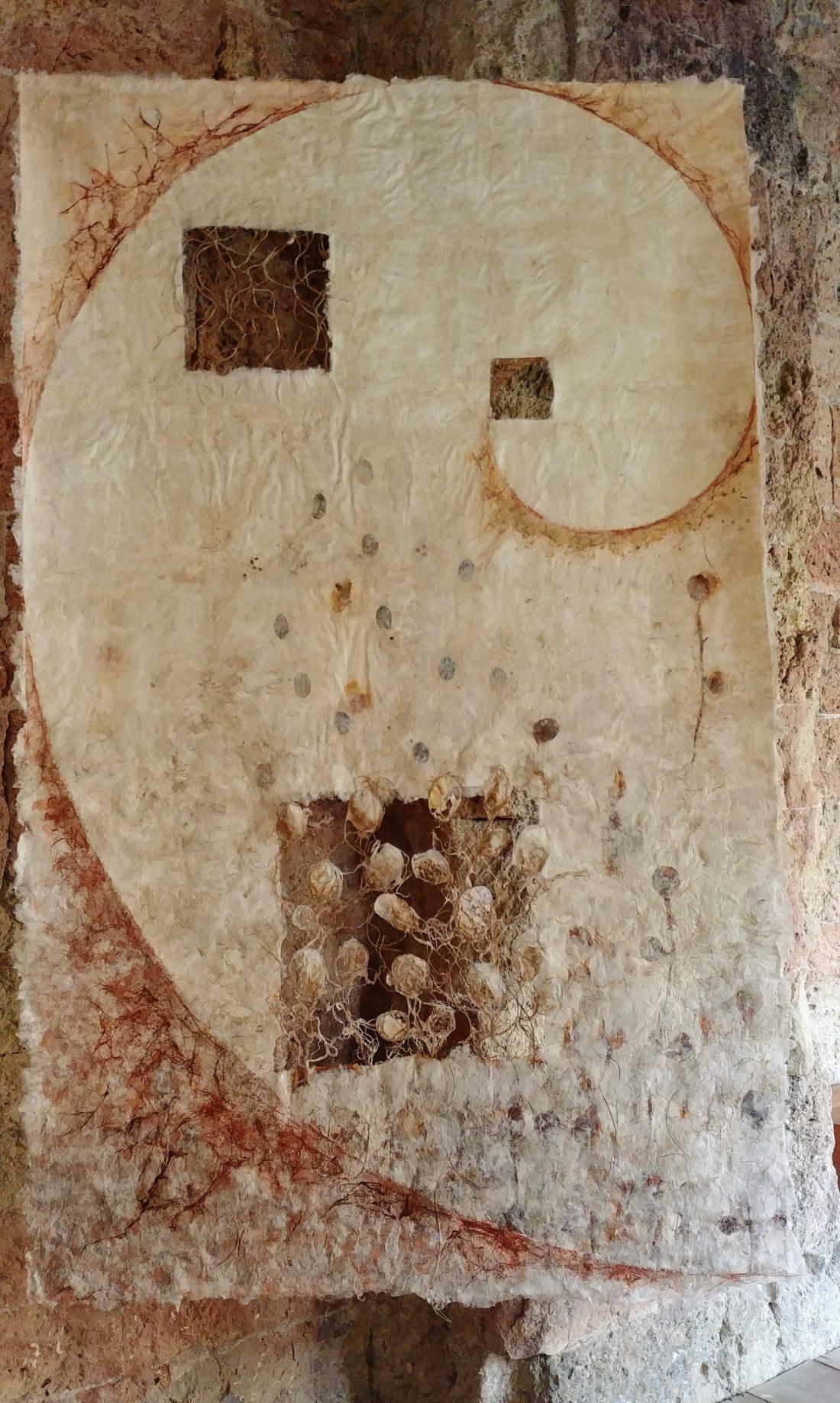 Le travail à deux s’est révélé empreint de ce cheminement spirituel. Au début, chacune s’affirme selon une trame, des couleurs et un graphisme communs. Ensuite, une recherche , une nécessité d’interpénétrer les matières propres à chacune a constitué l’essence même de la création et de leur envol pour traverser les défis lancés.
